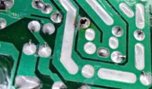 開けるとAC/DC変換器の異常。コンデンサ?の半田不良とショート。