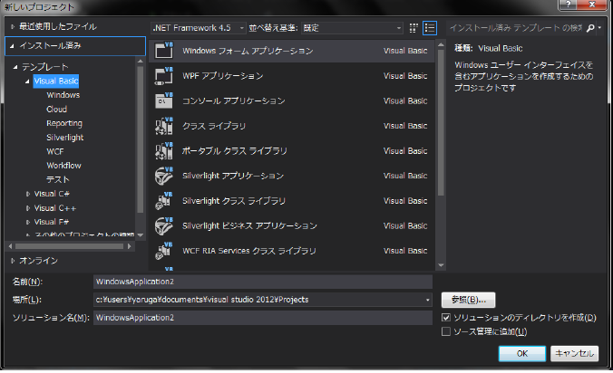 [Windowsフォームアプリケーション]を選択し、”名前”と”場所”を確認(変更)したら[OK]を選択する。